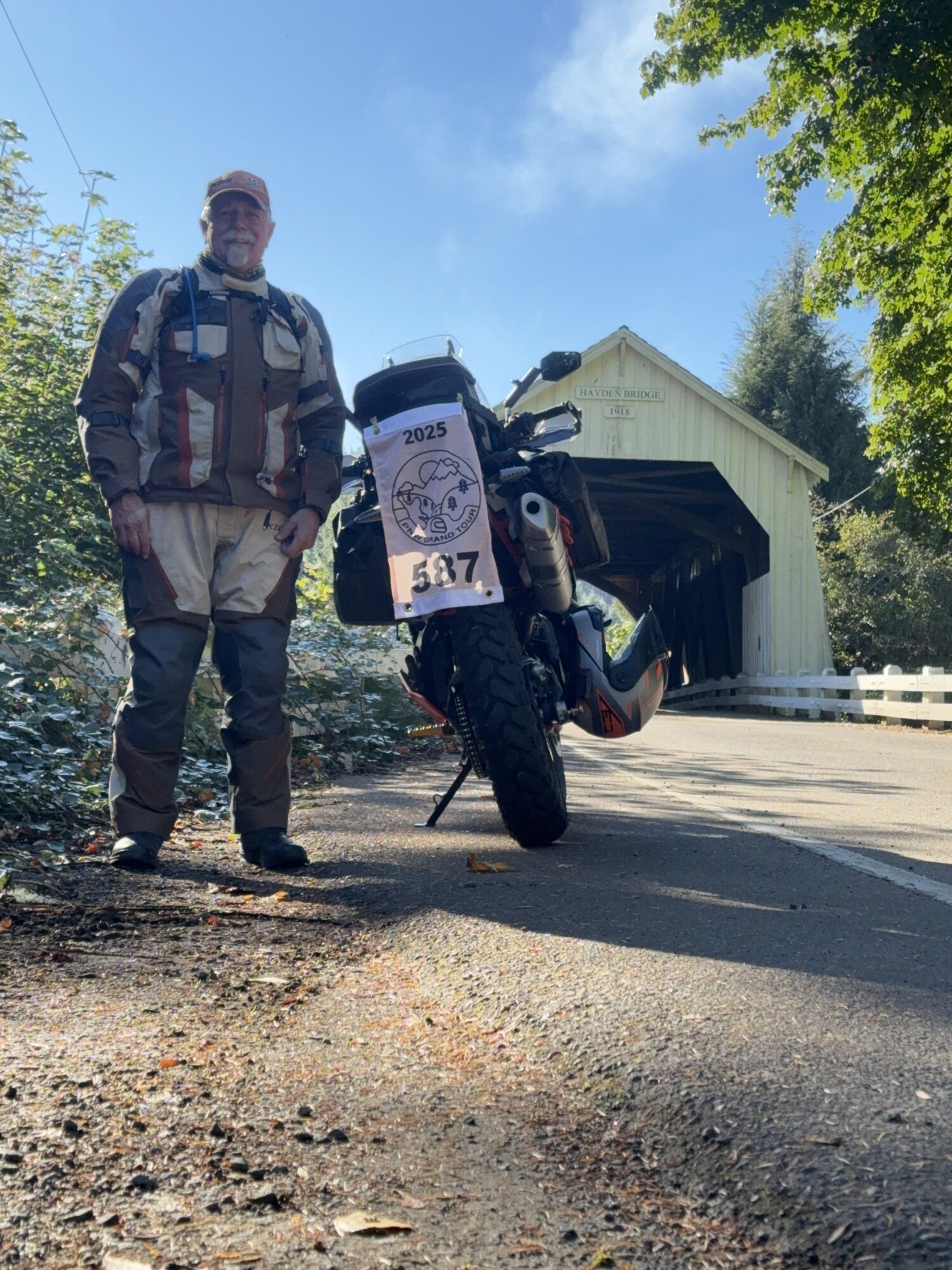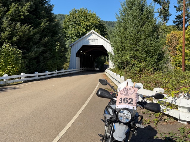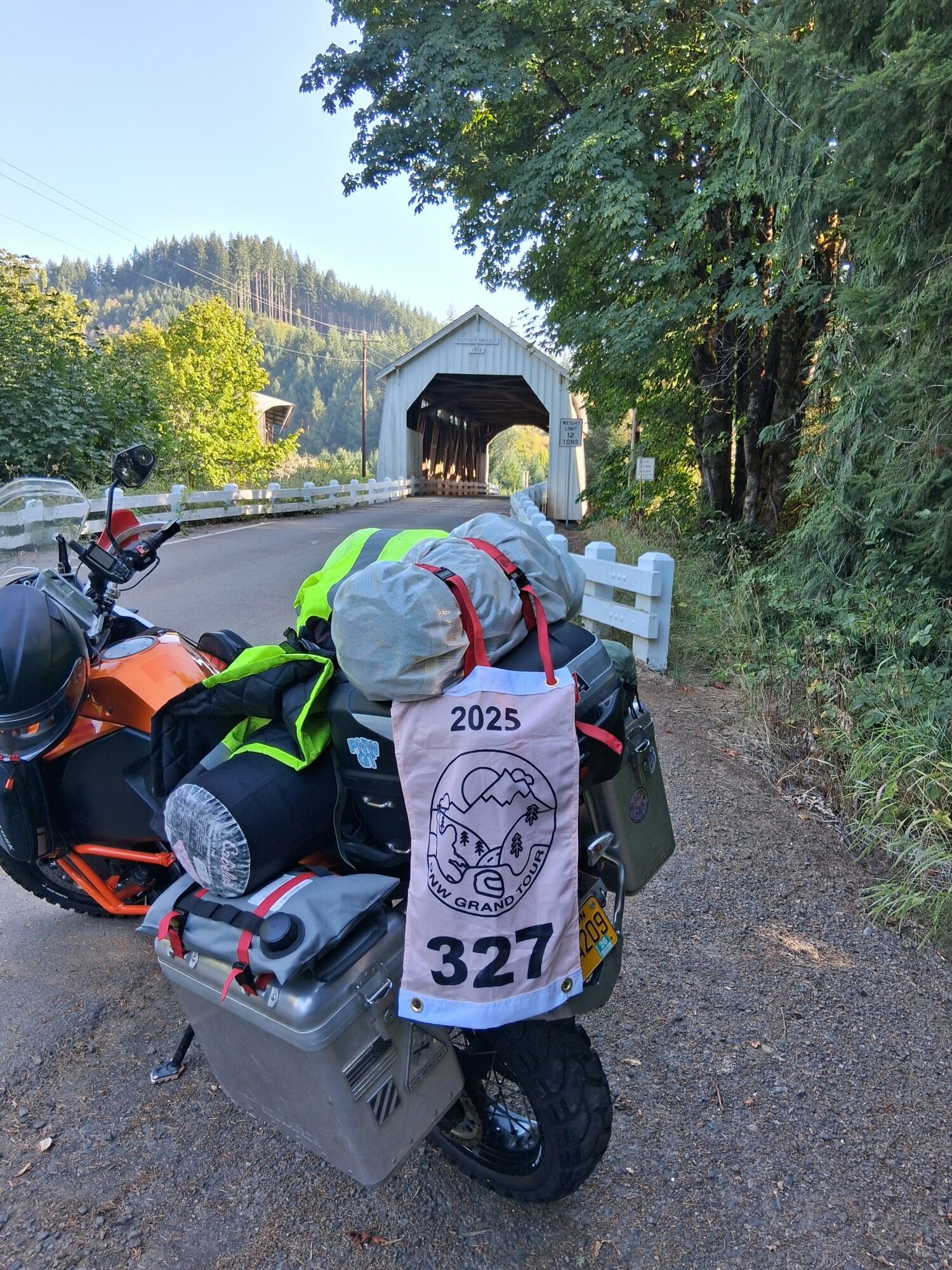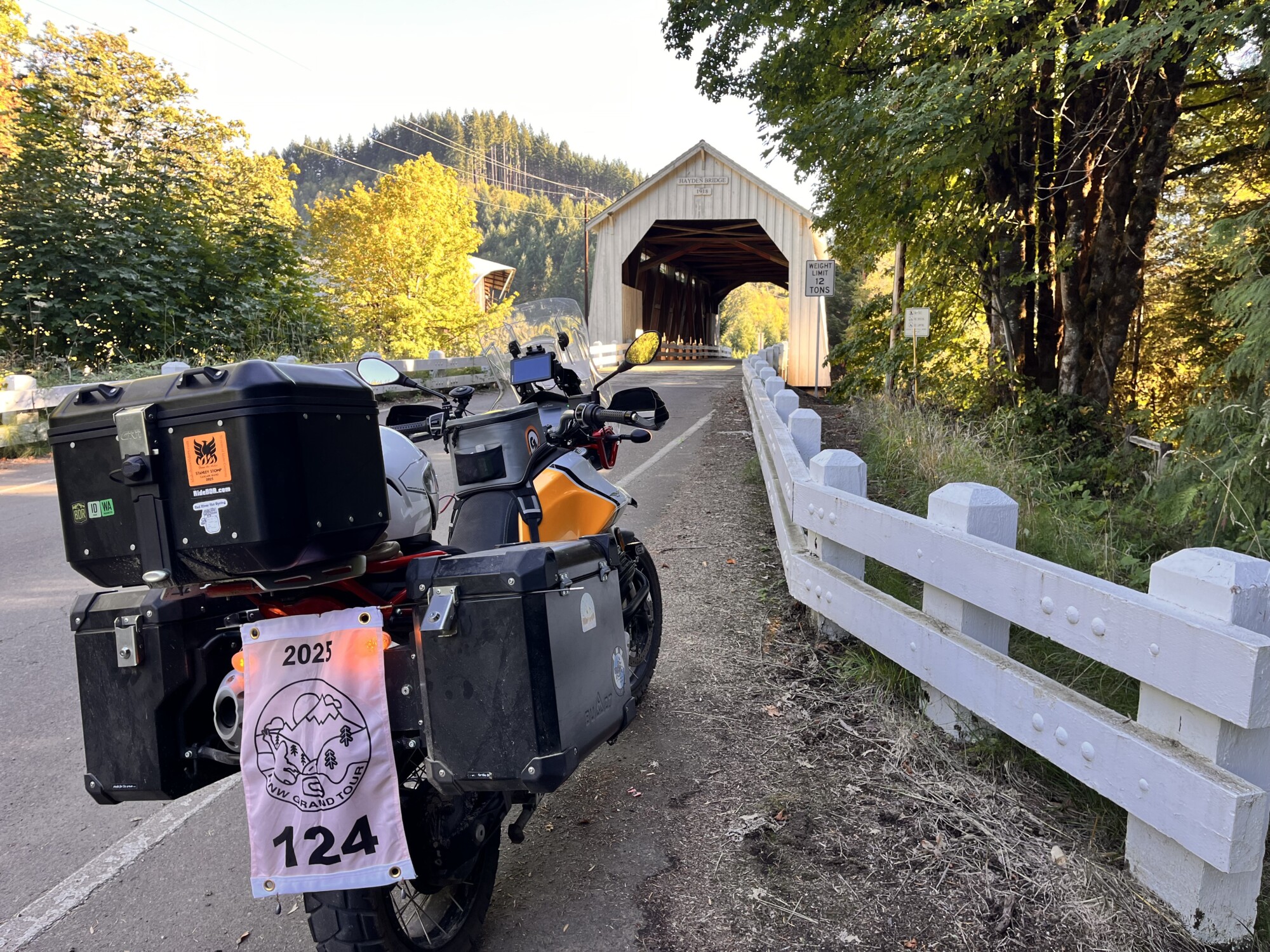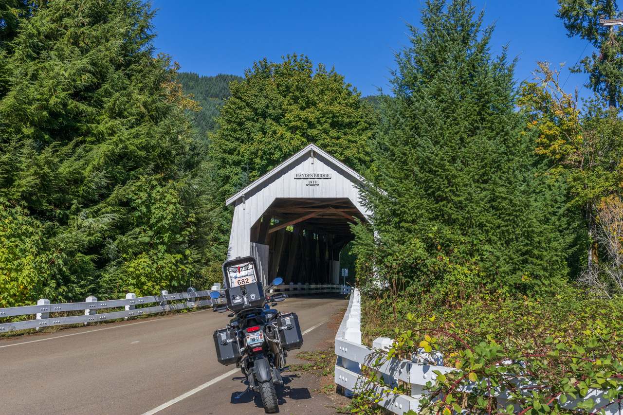 Take a picture of the Hayden Covered Bridge with your bike and flag in the picture.