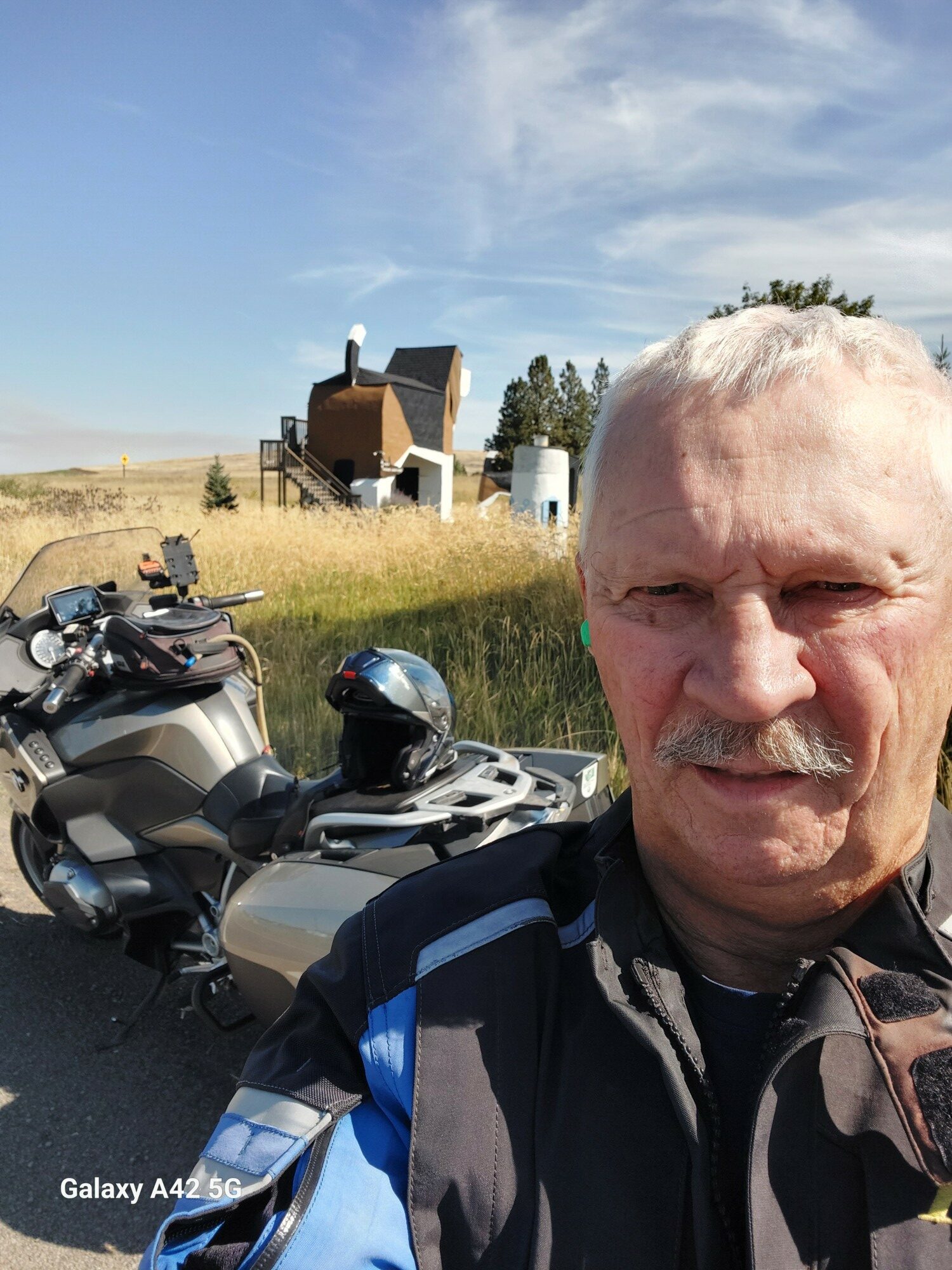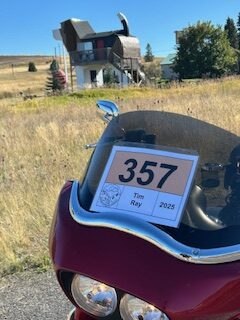 Take a picture of the giant dog at Dog Bark Park Inn with your bike and flag in the picture.