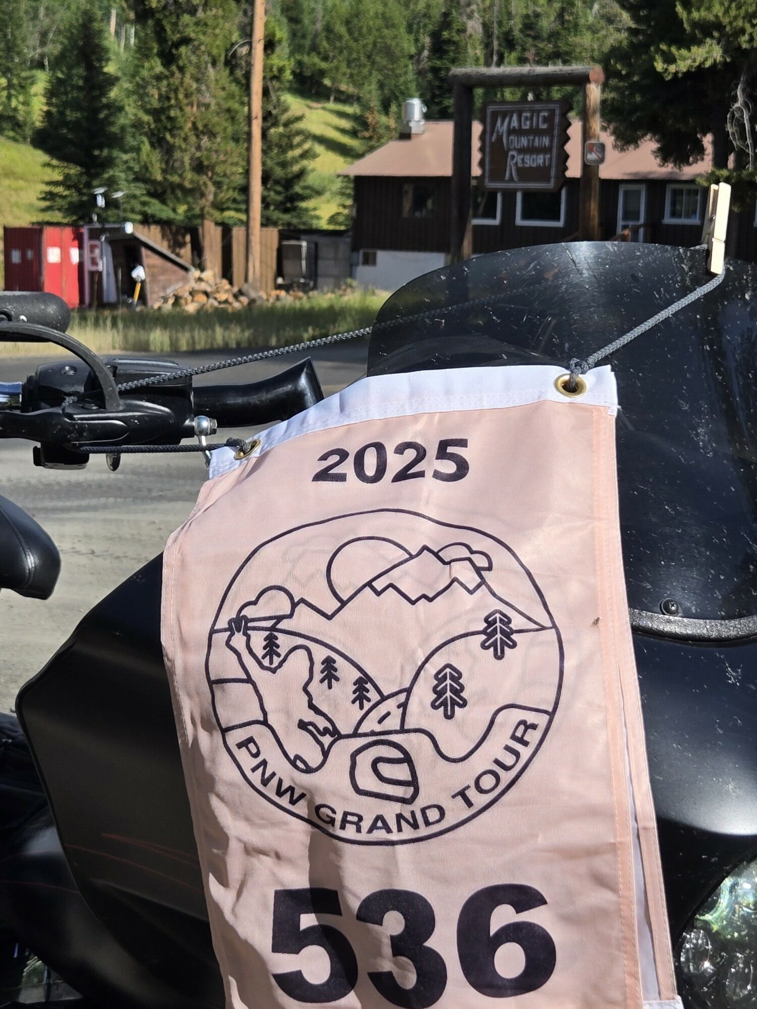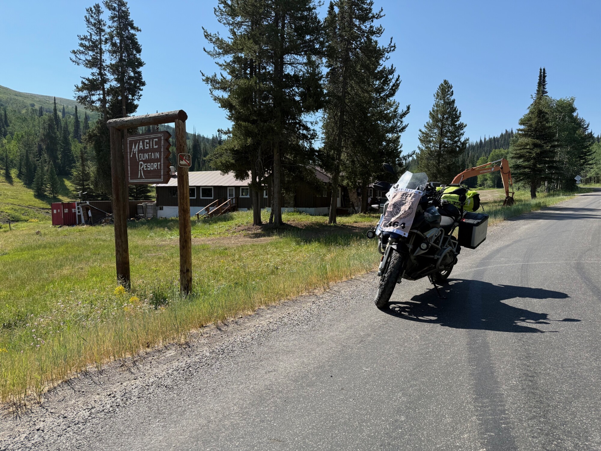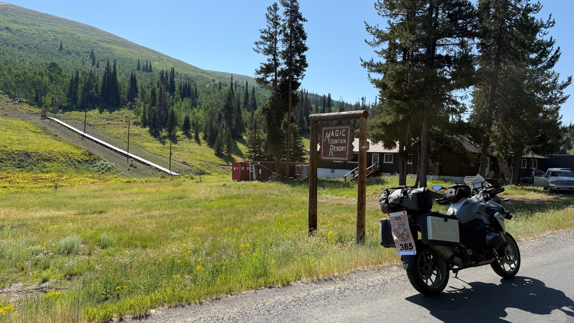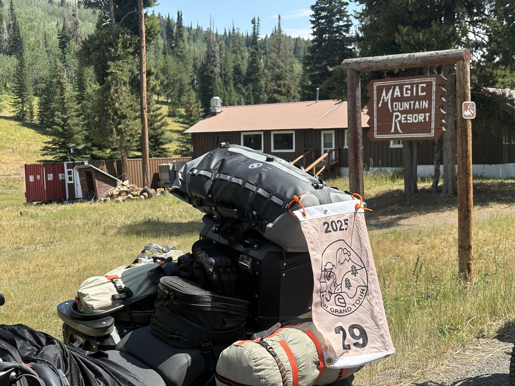 Take a picture of the Magic Mountain Resort sign with your bike and flag in the picture.