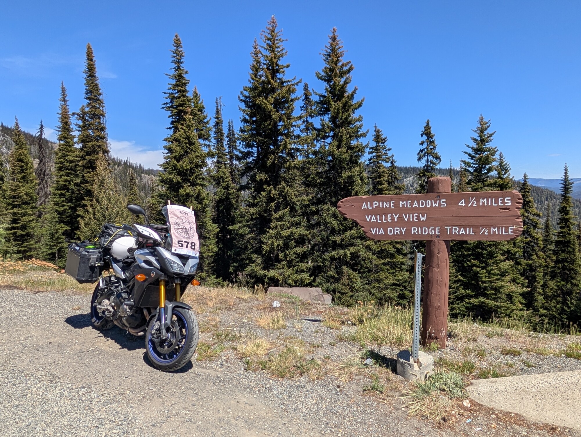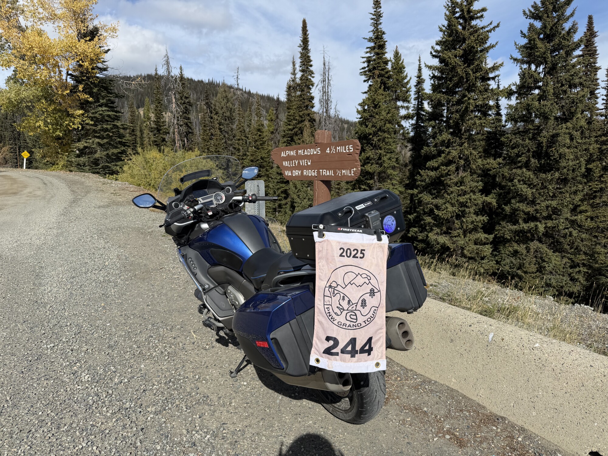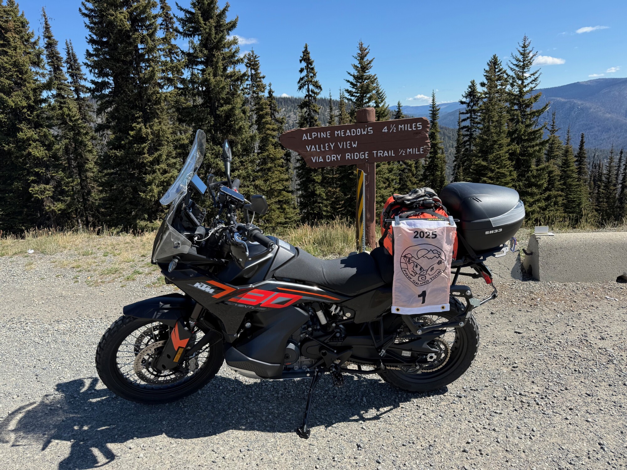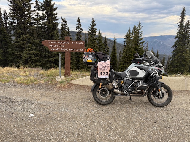 Take a picture of the Alpine Meadows sign with your bike and flag in the picture.